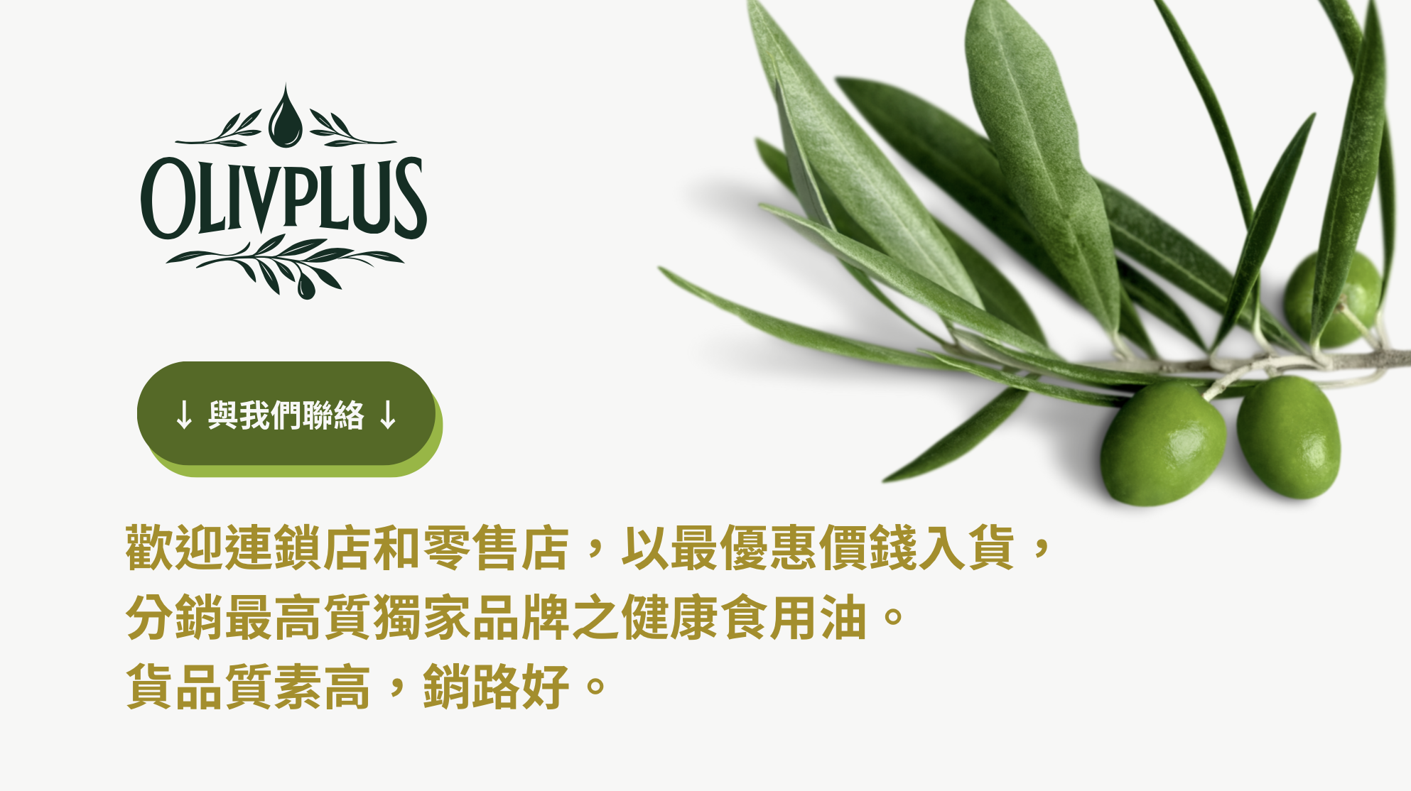 在香港這個國際都會,橄欖油不單只是家庭廚房裡的重要食材,更是餐飲業、零售業、美容養生服務的必需品。隨著健康飲食概念逐漸深入人心,愈來愈多消費者會特別留意「油」的選擇,尤其希望所使用的橄欖油來自有機認證、品質穩定,而且口感和香氣俱佳。Olivplus Oil 有機特級初榨冷壓橄欖油正好迎合了這個需要,除了零售市場銷售成績理想外,在橄欖油批發層面亦提供極具競爭力的價錢優惠,協助連鎖店、零售店及各類專業機構以最合理的成本,為客戶帶來最高品質的健康橄欖油推介。連鎖店與零售店的最佳選擇